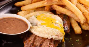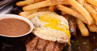 Flame-grilled rump steak layered with savoury ham, crowned with a perfectly fried egg and finished with rich trinchado gravy. Served with golden chips, this Portuguese classic is bold, comforting and crafted with honest, old-world flavour.